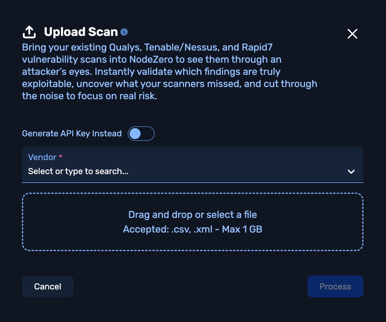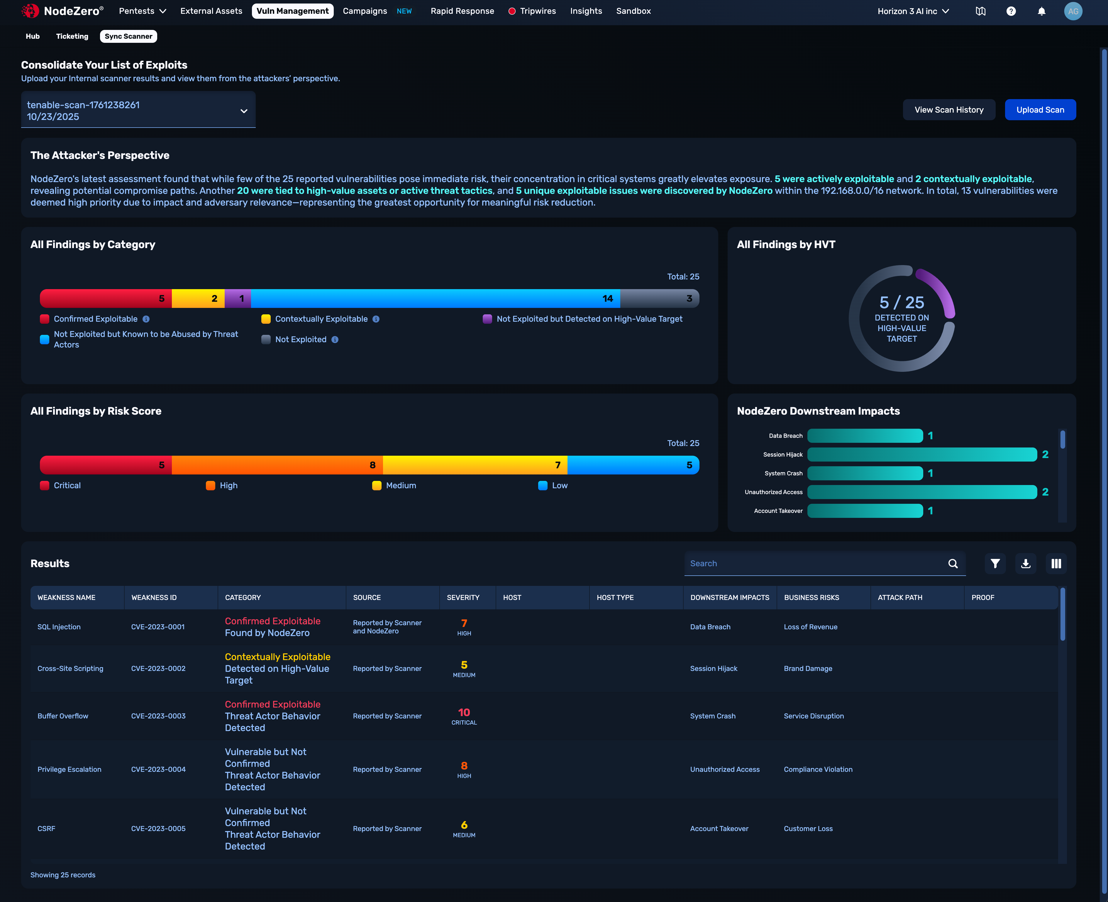 NodeZero's Vulnerability Risk Intelligence (VRI) feature enables customers to upload vulnerability scan exports from tools like Tenable (Nessus), Rapid7, and Qualys, and receive attacker-validated risk classification. NodeZero leverages real exploit evidence and attack correlation to prioritize findings based on what attackers can actually exploit.