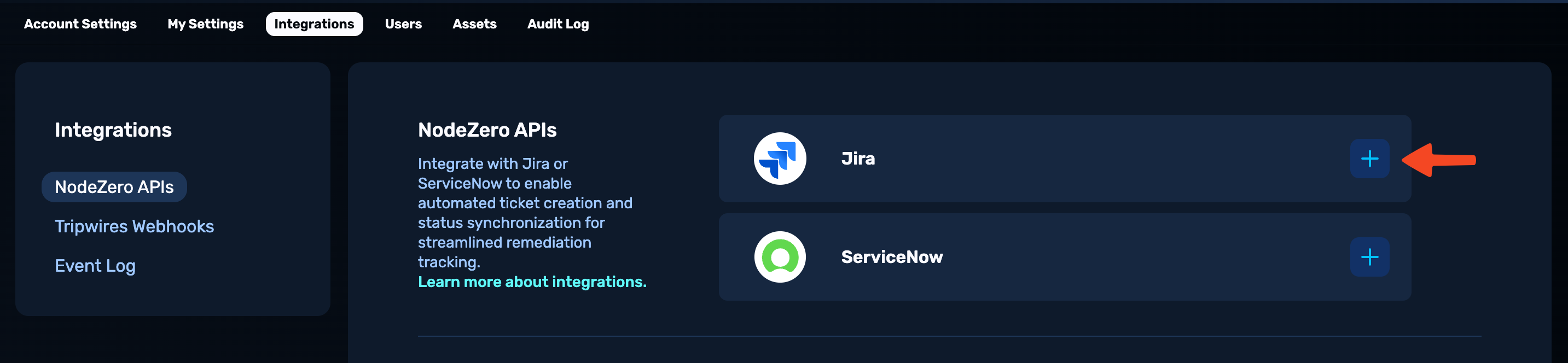 Configure a webhook for Vulnerability Management. You must set up Jira ticketing integration before setting up a webhook (see Configure Vulnerability Management APIs for instructions)