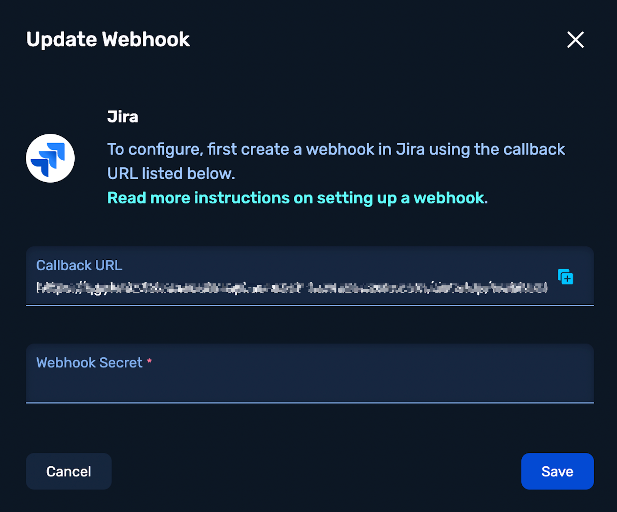 A URL is provided to use when setting up a Webhook. For more instructions on how to create a Webhook for the Jira integration, see the section 4. Setup Webhook in Jira.