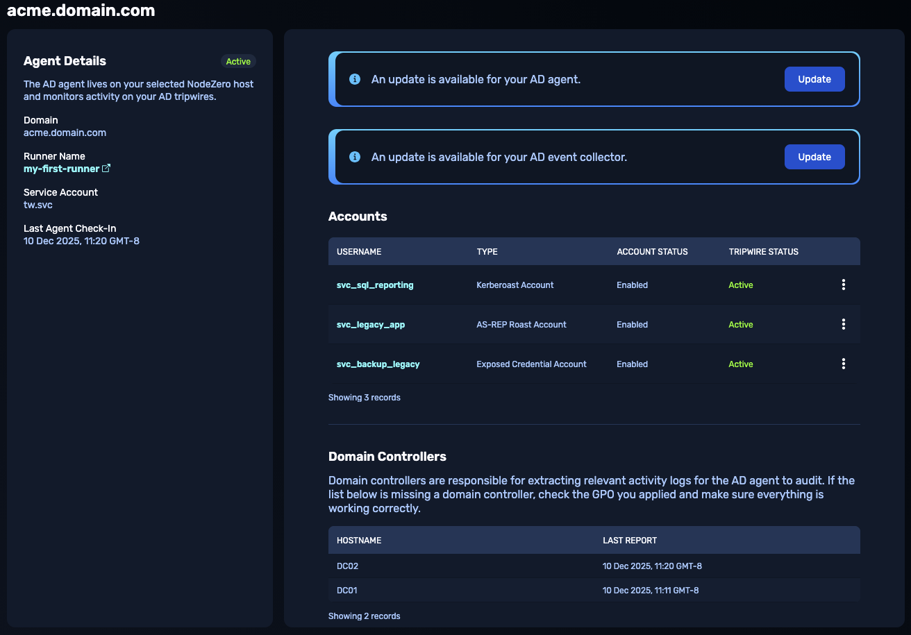 The AD Tripwires System requires an up-to-date NodeZero Runner to function properly. To update your runner: